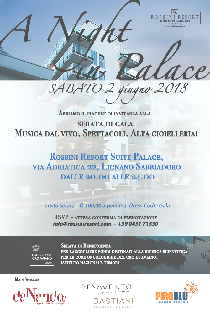 A NIGHT IN PALACE, è la prima serata di gala e beneficenza ideata dal Rossini Resort in collaborazione con la Fondazione CRO in programma il 2 giugno alle 20 a Lignano Sabbiadoro in un’ambiente e un’atmosfera esclusivi.